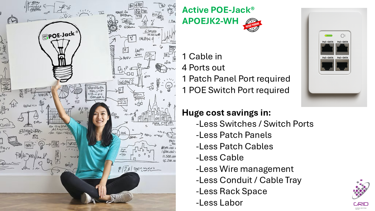New solutions offered by GRID Networking and the POE-Jack® offers some great environmental benefits from saving up to 75% less cabling required, 75% less patch cables, 75% less patch panels, 75% less switch ports, less cable management, less racks, less conduit and less packaging for all the items.