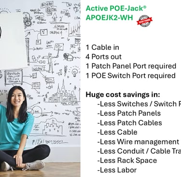 POE-Jack® disrupts the structured cabling industry that has been long stagnant without innovation in the copper premise cabling industry. POE-Jack® requires 1 cable, 1 patch panel port and 1 POE switch port all while providing a 4 ports Ethernet Outlet plate. Compared to traditional jack / patch panel products that require a dedicated cable for each port, so 4 cables, 4 patch panel ports and 4 switch ports that is substantially more product required but also a much larger footprint in racks, cabinets and in telecommunication rooms/closets. The environmental benefit to the reduction of these items is tremendous, the amazing part of it is that it saves money too that can help offset those other LEED requirements that often raise the costs of a project.