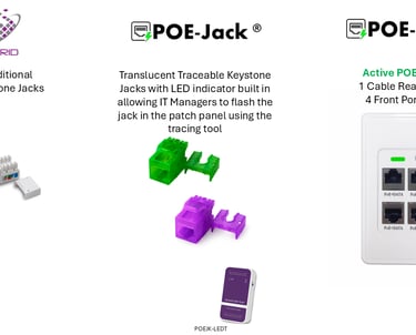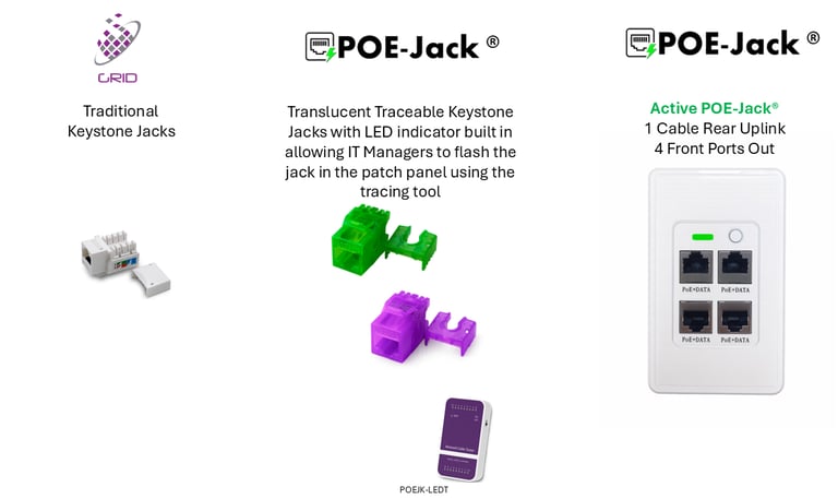 POE-Jack® disrupts the structured cabling industry that has been long stagnant without innovation in the copper premise cabling industry. POE-Jack® requires 1 cable, 1 patch panel port and 1 POE switch port all while providing a 4 ports Ethernet Outlet plate. Compared to traditional jack / patch panel products that require a dedicated cable for each port, so 4 cables, 4 patch panel ports and 4 switch ports that is substantially more product required but also a much larger footprint in racks, cabinets and in telecommunication rooms/closets. The environmental benefit to the reduction of these items is tremendous, the amazing part of it is that it saves money too that can help offset those other LEED requirements that often raise the costs of a project.